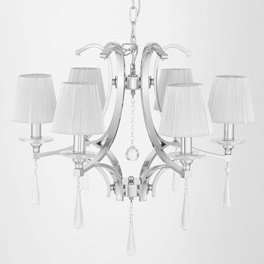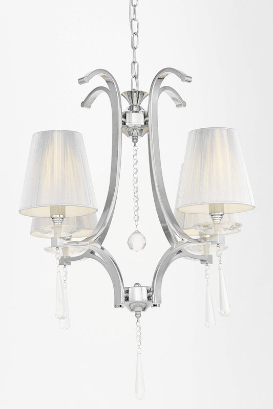 In der ausgewogenen, von klassischem Charme erfüllten Leuchtenserie VENISIA besteht das einzigartige Design, das mit einfachen, aber zahlreichen Verzierungen verziert ist, aus Metallelementen. Acht flache Metallbögen, die zu vier feinen Armen zusammengesetzt sind, die im Mittelteil durch zwei flache Scheiben verbunden sind. Der Endabschnitt jedes Arms wurde mit einer Metallfassung für die Glühbirne und einem runden Kristallsockel gekrönt, die die Zartheit des Lampenschirmdesigns perfekt betonen. Der cremefarbene Stoff, der ihre Rahmen umhüllt, lässt das Licht durch ihre gesamte Oberfläche dringen und schafft so einen Kronleuchter, der sowohl optisch einzigartig als auch voll funktionsfähig ist. Wir sollten auch die üppige Größe des Kronleuchters schätzen, dessen Durchmesser einen halben Meter übersteigt, sowie ein äußerst nützliches Merkmal in Form einer einstellbaren Länge des Kabels und der Kette.