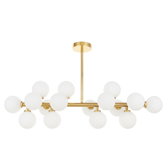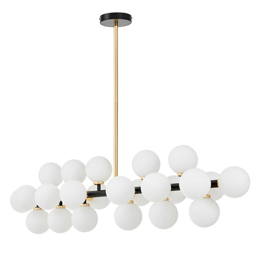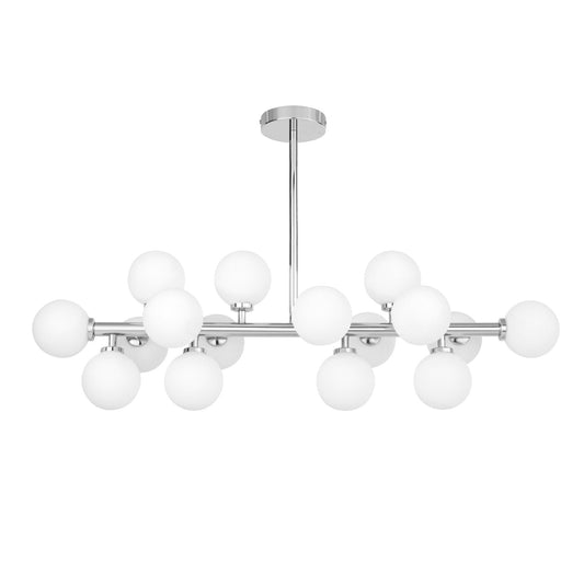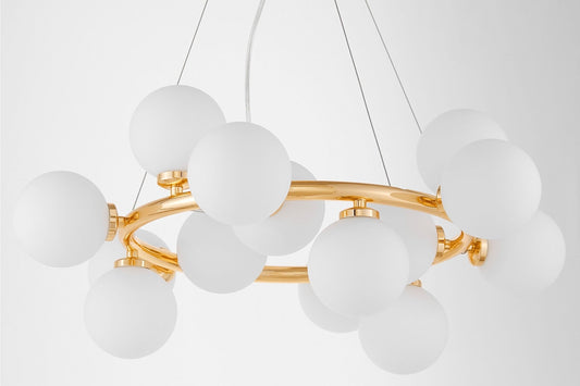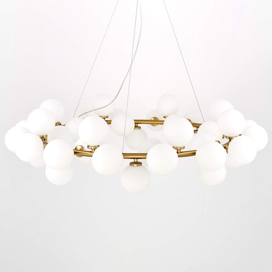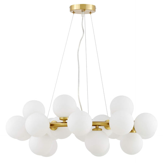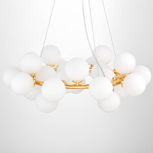 Die Pracht der MARSIADA-Pendelleuchte zeigt sich sowohl in ihrer Größe als auch in der erstaunlichen Anzahl von fünfundzwanzig Lampenschirmen. Das aus weißem Glas gefertigte Gehäuse der Lichtquellen passt perfekt zur Metall- und Messinghalterung. Die Form und Monumentalität der Lampe sind Ausdruck moderner Trends, die perfekt in den Raum eines repräsentativen Wohnzimmers, Hauseingangs und Esszimmers passt.