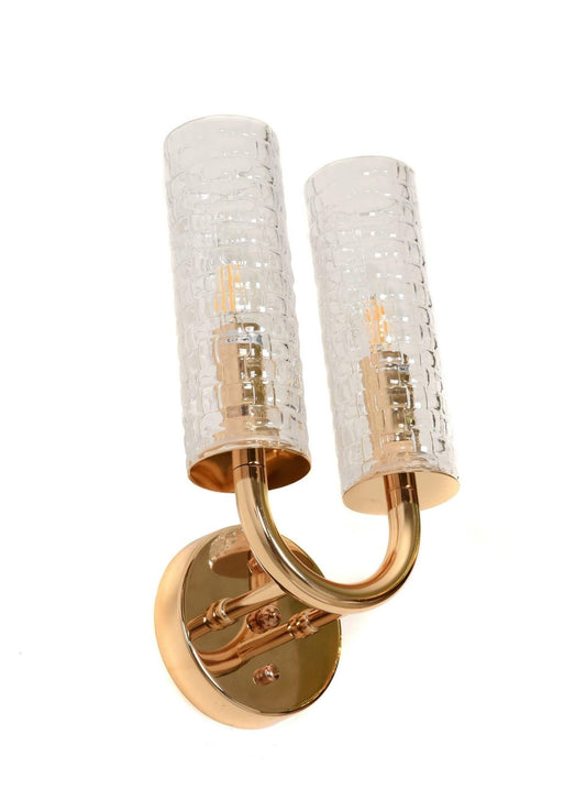 Die DONATTI-Serie steht in erster Linie für Eleganz, Originalität und wird durch dezente Dekorationen im Glamour-Stil hervorgehoben, die die Einzigartigkeit der Beleuchtung betonen. Die Wandleuchte besteht aus einer Metallstruktur in einer wunderschönen goldenen Farbe, deren angenehmer, warmer Farbton ihre Raffinesse und Raffinesse unterstreicht. Es besteht aus einem kreisförmigen Dachhimmel, aus dem zwei kurze Röhren hervorgehen, die als Träger für den goldenen Metallbogen dienen, der die Arme für die beiden Lampenschirme bildet. Sie haben die ursprüngliche Form von hohen, schlanken Röhren aus Glas mit charakteristischer Struktur. Sie sind auf Sockel montiert, die gleichzeitig einen Abschluss für sie von unten bilden. In jedem der Lampenschirme können Sie eine kleine Glühbirne platzieren, die wie eine unter dem Glas geschlossene Kerze aussieht und einen gedämpften, stimmungsvollen Schein abgibt.